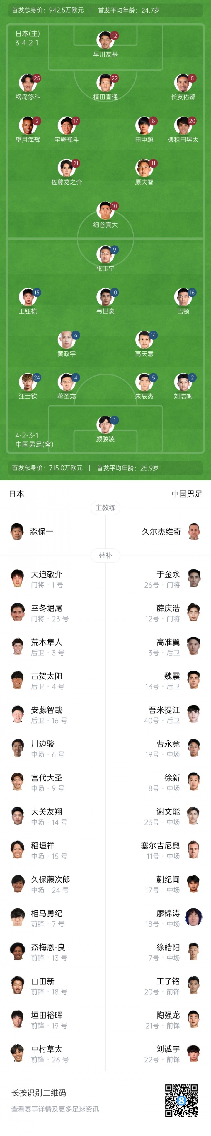 日本替补:1-大迫敬介、23-幸冬堀尾、3-荒木隼人、4-古贺太阳、16-安藤智哉、6-川边骏、13-杰梅恩-良、14-大关友翔、15-稻垣祥、18-山田新、19-垣田裕晖、24-久保藤次郎、26-中村草太、7-相马勇纪、9-宫代大圣